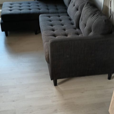 Lækker 3 år gammel nærmest som ny, hjørnesofa i gråt stof med chaiselong og løs nakkestøtte. Sofaen har lige, polstrede sæder og ryglæn samt metalben. Udformet som en vinkelsofa med god siddeplads langs begge sider. Egnet til stue eller opholdsrum, hvor der ønskes en større sofagruppe med chaiselongfunktion.