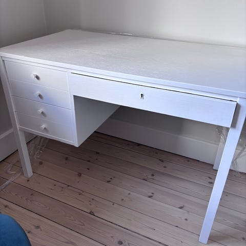 Hjemmelavet væghængt skrivebord malet hvidt med flot tapet i sølv/gråt samt påsatte spejle. I rigtig fin stand.