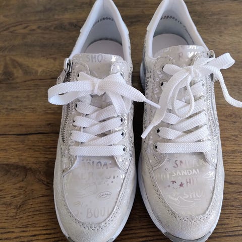 Rieker sneakers i størrelse 38. Modellen er i hvid med lyse detaljer og snørelukning. Overdelen fremstår i glat materiale med perforerede sidefelter, og skoen har polstret kant for øget komfort. Ydersålen er mønstret gummi, der giver et stabilt fodfæste. Brugt nogle få gange.