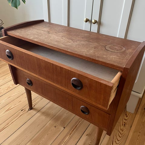 Kommode i team, fungerer fint, men mangler nederste. Er blevet fikset med en teakplade som erstatning
