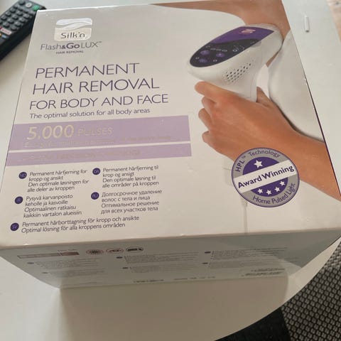 Iluminage Touch hårfjerningsapparat i hvid. Apparatet er designet til permanent eller langvarig reduktion af uønsket hårvækst ved hjælp af lysbaseret teknologi. Enheden har kontrolpanel på basestationen med flere funktionsknapper og indikatorikoner. Håndsættet er forbundet til basen med ledning. Velegnet til brug på krop og eventuelt ansigt efter producentens anvisninger. Leveres med tilhørende strømledning og tilbehør som vist på billedet.