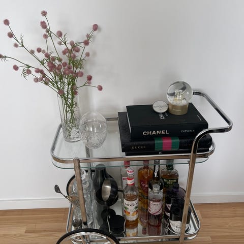 Smukt barbord / bakkebord / serveringsbord i lakeret mahogni. Bakken er aftagelig og har flotte messingdetaljer i hjørnerne. Bordet er solidt og flot håndværk. Det har enkelte cirkler på bakken og lidt ridser på benene, men er ellers i rigtig fin stand. Det har nok haft hjul engang men de er taget af.