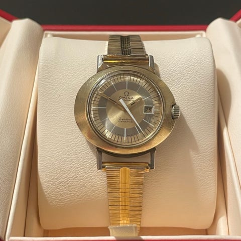 Vintage Omega Geneve dameur i 20 microner forgyldt kasse med rustfrit stål bagkasse fra 1971. Værket er et manuelt Omega in-house værk, cal. 485. Let patinieret, hvidfarvet skive med sort farvede ”Breguet style” Arabertal og sorte time & minut visere. Værkets serienummer 33.666.XXX daterer uret til 1971. Ref. nr. er 511.409 og uret måler ca. 23mm i diameter, målt uden krone. Der er monteret originalt Omega glas og krone i double. Uret kommer med en ny ”Omega style” brun læderrem med original Omega spænde i double. Uret er serviceret i marts 2026, går og holder tiden fint. Uret leveres i en original Omega æske. Perfekt som gave! Der ydes 14 dages returret. Husk, at se andre spændende ure, som jeg har til salg herinde:-) !!!KUN SERIØSE HENVENDELSER!!!