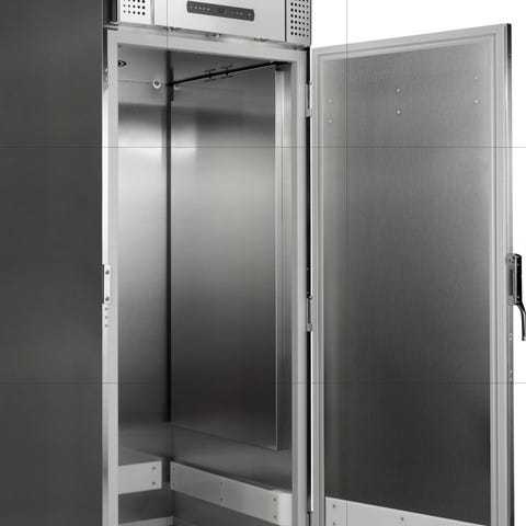 Monocoque-struktur i rustfrit stål AISI 304 og udvendig scotch-brite satinfinish; 80 mm isoleringstykkelse med HFC-frit skum med høj densitet (40 kg/m3); varmgasaftøning og fordampning af kondensvand; gulv i rustfrit stål ; indvendigt lys indvendig og udvendig luftstrøm; selvlukkende døre ved 100°; patenteret, tropebestandigt monoblok-køleenhed (i klimaklasse 5); lås som standard; 230V/50Hz enfaset strømforsyning som standard.
