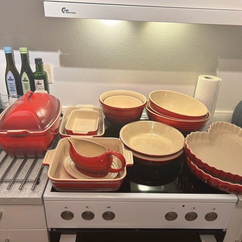 Le Creuset stentøj køkkenudstyr sæt i rød. Sættet omfatter rektangulært fad, rundt fad, to små skåle/ramekiner, lille kande med hank og lågkrukke med skeåbning i låget. Alle dele er udført i glaseret stentøj med lys inderside og farvet yderside. Velegnet til madlavning, servering og opbevaring i køkkenet.