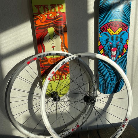Hjulene har lukkede lejer, så de ruller bare godt. Hjulene har ikke kørt meget hvilket også kan ses på billederne. Der sidder 28.eger både for og baghjul.