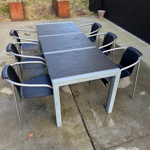Trip Trap havemøbelsæt bestående af havebord og 4 stole. Bordet har rektangulær bordplade og ben i træ og metal. Stolene er fremstillet i brunt polyrattan med armlæn og høj ryg.