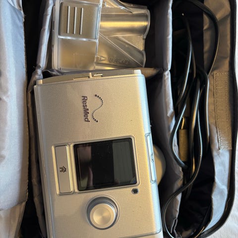 ResMed CPAP-apparat med tilhørende masker og slanger. Sættet omfatter et CPAP-apparat med display, luftslanger samt mindst to forskellige masker. Udstyret er beregnet til behandling af søvnrelaterede vejrtrækningsproblemer, hvor apparatet leverer et kontinuerligt lufttryk gennem masken. Maskerne fastgøres med justerbare remme, og slangerne forbinder maskerne med apparatet. Velegnet til brugere, der har behov for CPAP-behandling og allerede kender til indstilling og anvendelse af denne type udstyr.