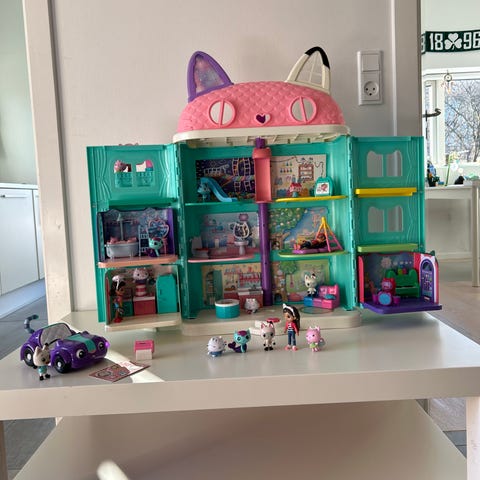 Gabbys dukkehus i plast med flere etager og rum. Huset er udformet som et kattehus i turkis og lyserød med hvide vinduesrammer. Indvendigt er der forskellige etager og platforme i flere farver samt detaljer som rutsjebane, elevatorrør og små møbler. Der medfølger små figurer og tilbehør, som kan placeres rundt i huset. Egnet til leg med små dukker og figurer i tilsvarende størrelse.
