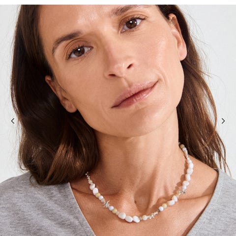 Halskæden består af lyse perler kombineret med små forgyldte elementer og stjerneformede vedhæng.