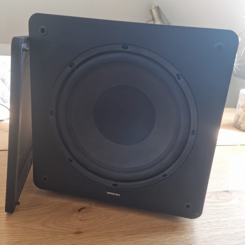 Argon Sub 840 subwoofer i hvid. Aktiv subwoofer med indbygget forstærker og frontmonteret basenhed. På bagsiden findes justering af volumen, fase og delefrekvens samt tilslutninger via line-indgang (RCA) og højttalerterminaler. Egnet til brug i hjemmebiograf eller stereoanlæg, hvor der ønskes supplerende basgengivelse.
