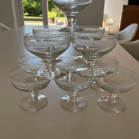 Jeg sælger de 11 champagneskåle, som også kan anvendes som dessertglas samlet for 900 kr.