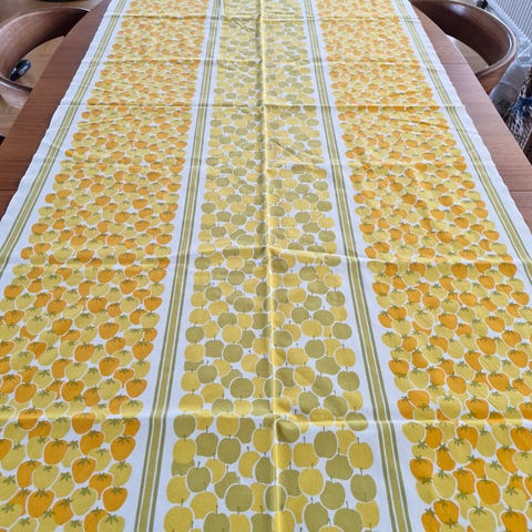 Retro dug med cirkelmønster i gule, og brune nuancer. Stoffet har et grafisk mønster med koncentriske cirkler og prikker fordelt over hele fladen. Måler 118x115 cm.
