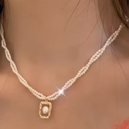 45 cm ferskvandsperlehalskæde til kvinde med tre hvide perler samlet på en sort snor foran. Halskæden har justerbar lukning med knuder og en ekstra perle for enden af snoren.