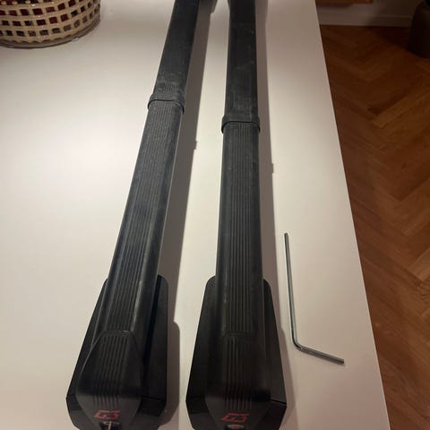 Har til 2 sæt bøjler den ene er til at sidde i kanten af døren har siddet på en volvo s60 den anden er til tagræling har siddet på en fordel ranger
