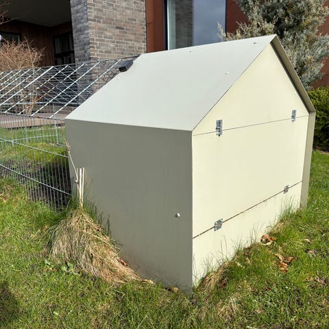 Kaninbur og udendørs løbegård i træ. Buret er hævet på ben og har flere rum med trådnet, døre og rampe mellem niveauer. Overfladen er malet i hvid og sort. Løbegården er en lav, rektangulær indhegning med trækasse/skjul og faste plader som overdækning. Velegnet til kaniner eller andre smådyr i haven eller i udhus. Ingen yderligere specifikationer oplyst. 2 stk løbegårde og huset