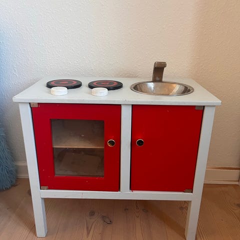 Sødt lille legekøkken med håndvask, ovn og skuffer.