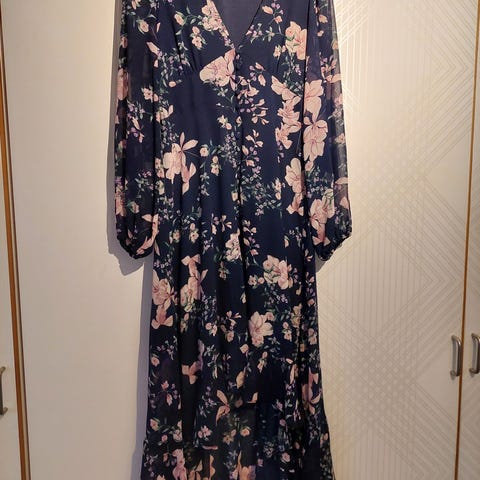 Smuk kjole fra bubbleroom. Den er fin som bl.a konfirmations eller studenterkjole. Kjolen har v-udskæring og lange ærmer med blondelook og blomsterstruktur. Forstykket har knaplukning ned langs midten. Materialet er let og foret, hvilket giver et dækkende udtryk.