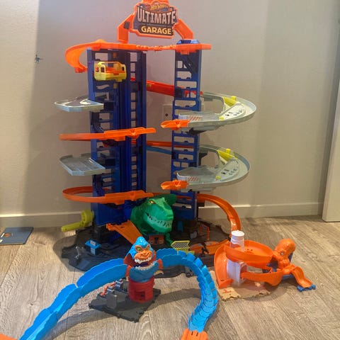 Hot Wheels Ultimate Garage bilbane legetøj. Stor, bilgarage med flere etager, ramper og parkeringspladser til små legetøjsbiler. Sættet indeholder spiralformede nedkørsler, mekaniske elementer og en stor dinosaur-figur, som kan interagere med bilerne. Egnet til leg med Hot Wheels-biler og lignende små metal- eller plastikbiler indendørs på gulv eller bord.