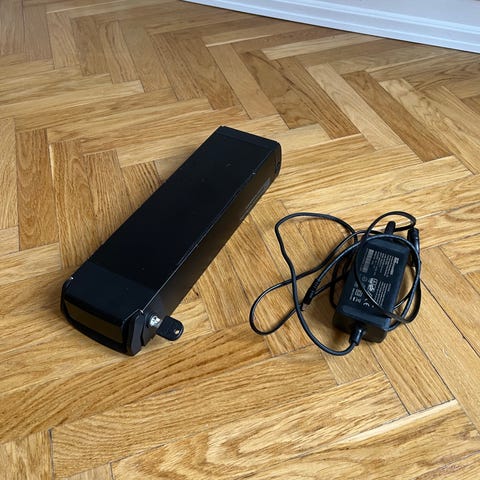 Promovec batteri til elcykel / ladcykel med kapacitet på 19,2Ah. Batteriet er udført i sort kabinet og er designet til montering bagpå cyklen med integreret baglygte. Medfølgende oplader ses på billederne.