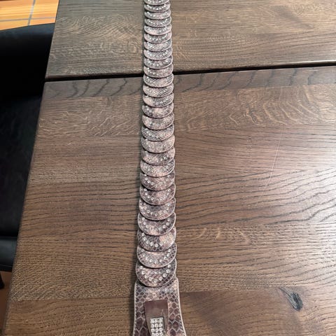 Brunt læder bælte til kvinde med bred midterdel og lange bindebånd. Unikt bælte med et dekorativt spænde i glas med lys og mørk kontrast. Velegnet som taljebælte over kjoler, tunikaer eller bluser. Længde ca. 118 cm.