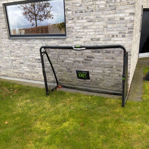 Fodboldmål til have med backstop-net. På målet er der monteret ekstra afskærmning. Velegnet til at holde fodbolde inden for et afgrænset område omkring terrasse eller græsplæne. Net og stolper kan opstilles langs en side af haven eller omkring et spilområde efter behov. Har et lille hul i nettet grundet en græsslåmaskine der kom lidt for tæt på.