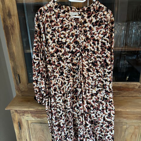 KAFFE kjole til kvinder i str. 34. Kjolen er fremstillet i viskose og har et multifarvet mønster i nuancer af blandt andet grøn, blå og beige. Modellen har lange ærmer og v-udskæring. Velegnet som hverdags- eller fritidskjole.