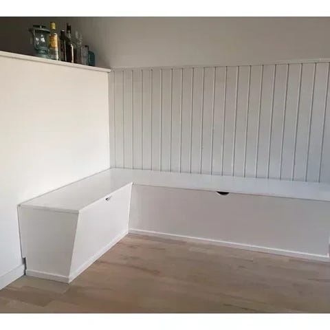 Fodlisten bliver bygget ind i bænken så den går helt ind til væggen. Bænken er med vippelåg og med valgfri ruminddeling.