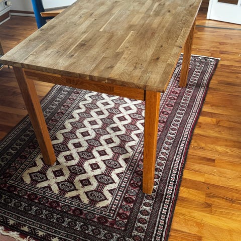 Solid acacia wood dining table. 160cm width x 76cm height x 95cm depth.