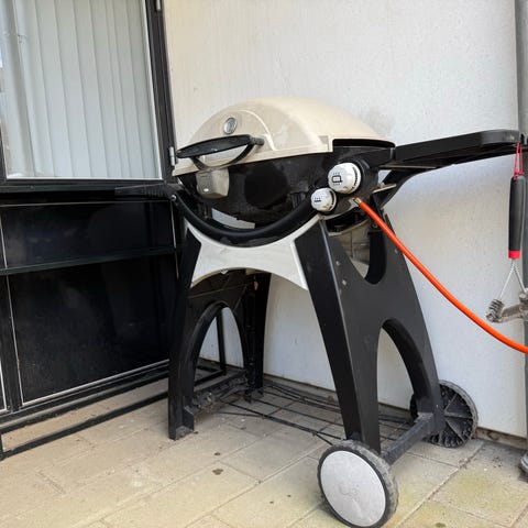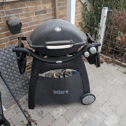 Weber Q gasgrill med stativ. Grillen står på vogn/stativ med hjul og har sideborde på begge sider. Tilsluttes gasflaske via gasslange. Velegnet til udendørs madlavning på terrasse eller altan. Farve overvejende sort med metalstel.