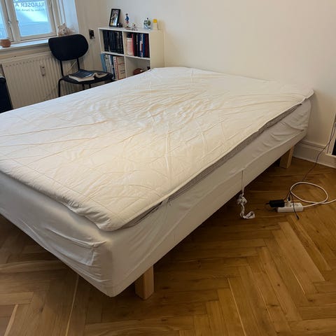 IKEA seng i grå stofbetrukket ramme. Sengen har en hovedgavl med buet form. Madrassen medfører men ingen topmadras. Madrassens størelse er 140x200
