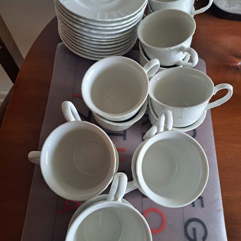 Knabstrup Keramik til salt, peber, fingersalt, smør, lillbeholder med citat, agurkesalat, sild og et lille fad. Bortgives.