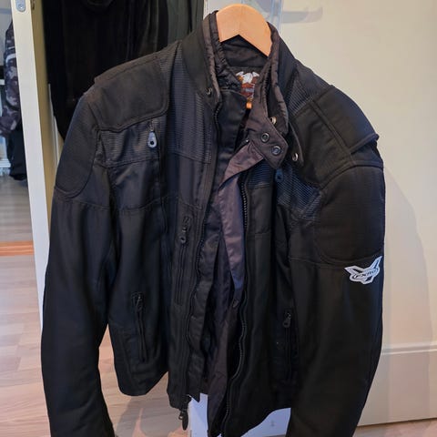 Harley-Davidson FXRG motorcykeljakke i størrelse S passer også en medium. Jakken er i sort med orange detaljer og har aftageligt inderfor med quiltet foring. Inderforet er fremstillet med 3M Scotchlite-materiale og består ifølge mærket primært af polyester. Jakken er egnet som motorcykeljakke med fokus på synlighed og komfort ved kørsel. Velegnet til brug i køligere vejrforhold, hvor der er behov for ekstra isolering.