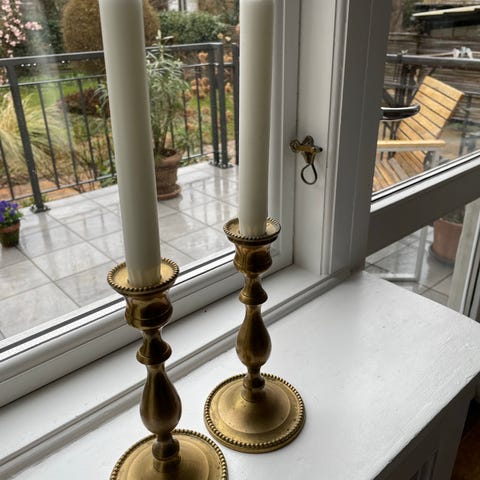 Antikke lysestager i messing. Sættet består af høje gulvlysestager med drejede, dekorative former. Velegnede som gulvdekoration eller som store lysestager i stue, gang eller andre opholdsrum.