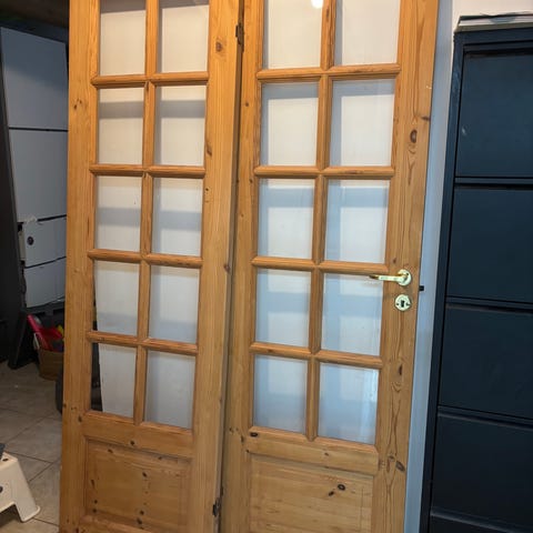Døre med glas., 2 stk. franske døre med 3-lags glas fag (15vinduer). Mål 97 x 223 cm. 750,-kr. for begge.