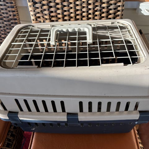 Transportkasse til kæledyr i hård plast. Kassen er grå med pink håndtag og lukkebeslag. Låget har ventilationsåbninger og kan åbnes helt op for nem adgang. Velegnet til transport og opbevaring af mindre kæledyr, f.eks. i bil eller ved dyrlægebesøg.