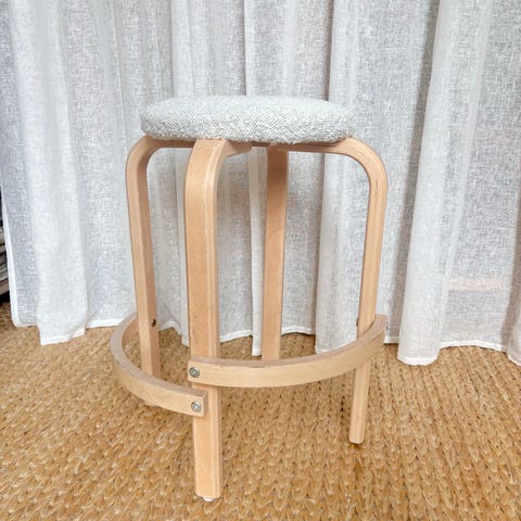 Skamlen er perfekt som ekstra siddeplads i stuen, som puf ved sofaen eller som en dekorativ detalje ved et sminkebord eller i entréen. Den står stabilt og er i flot stand.
