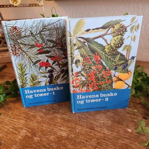Politikens Forlag Havens buske og træer bind 1 og 2 havebøger med farveillustrationer af forskellige buske og træer til haven. Bøgerne gennemgår arter med botaniske beskrivelser, latinske navne og eksempler på anvendelse i haven. Indeholder tegninger af planter, blade, blomster og havemotiver samt oversigter, der kan bruges til identifikation og planlægning af beplantning i haven.