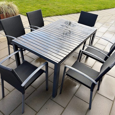 Havesæt bestående af rektangulært havebord og 5 matchende stole. Sættet er sort og stole med fletlook. Egnet til udendørs brug på terrasse eller altan. Bordet har lige ben og en overflade, der er let at tørre af. Stolene har høj ryg og slanke ben, som kan skubbes ind under bordet for pladsbesparelse.