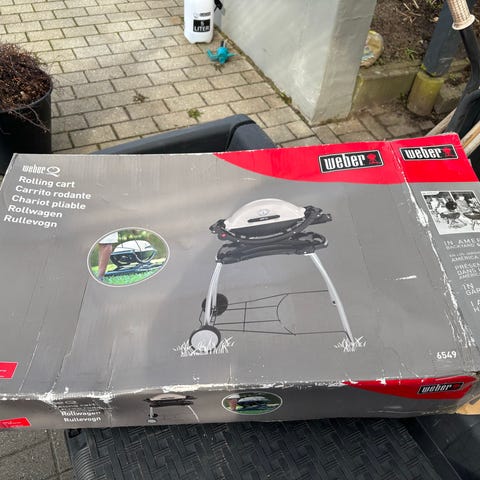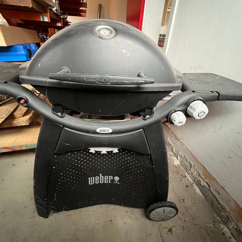 Weber Q gasgrill i sort. Grillen har låg med indbygget termometer og to betjeningsknapper på siden. Grillristen er i støbejern og opdelt i to sektioner. Grillen står på vogn med hjul og integreret frontpanel med Weber-logo. Velegnet til udendørs madlavning på terrasse eller altan. Ny brænder og elektrisk tænding udskiftet sidste år. Risten trænger til en kærlig hånd - Grillen fungerer perfekt
