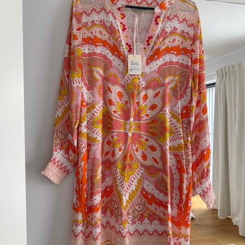 sommerkjole i silke i str. M. Kjolen er multifarvet med et mønstret print og er uden ærmer. Materialet er let og glat, egnet til brug i varmere vejr. Pasformen fremstår som en klassisk sommerkjole til kvinder, der kan bæres alene eller med let lag-på-lag tøj.