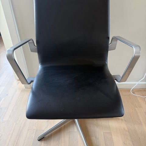 Oxford kontorstol med armlæn designet af Arne Jacobsen. Cognacfarvet læder. Trænger til ompolstring. Understel med hæve- /sænkefunktion, der dog ikke virker.