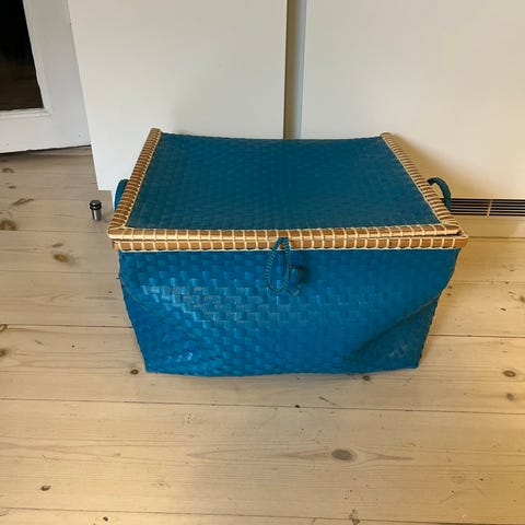 Flettet kurv med låg. Ø ca 38 cm på det bredeste. Plet i bunden