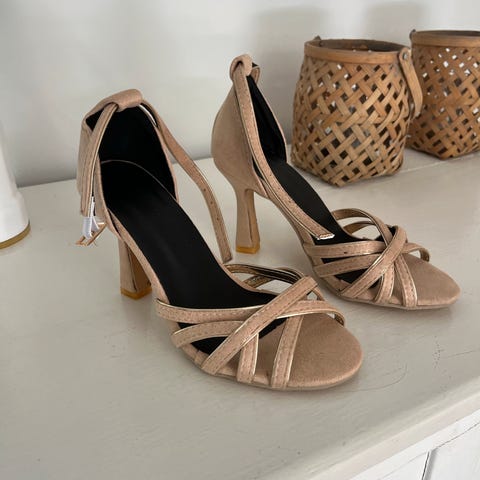 Cremefarvet højhælet sandal med en anelse glimmereffekt og små sten på ankelremmen.