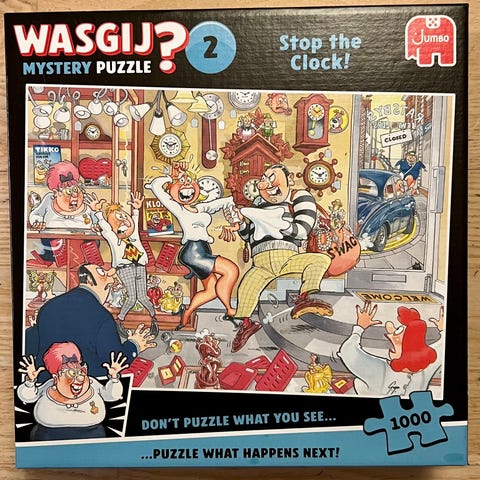 Wasgij Original Puzzle 8 High Tide! puslespil. Motivet viser en strand- og byscene med mange figurer og detaljer.