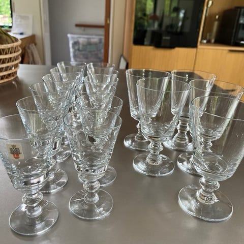 Wellington produceret 1976: 1 rødvin 14 cm, 7 hvidvin 12 cm, 5 hedvin 10 cm, 6 snaps 8,5 cm.