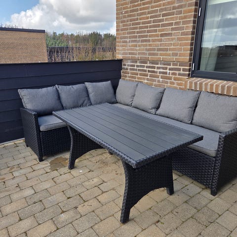 Udendørs hjørnesofa træ med lyse hynder