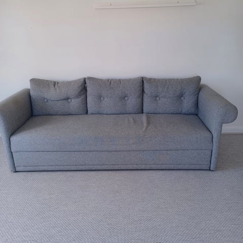 IKEA sofa i mørkegråt stof. Sofaen har lige armlæn og medfølgende ryghynder i samme farve og materiale. Den kompakte størrelse gør den velegnet til mindre stuer, værelser eller kontorer, hvor der er behov for en enkel siddeplads. Designet er enkelt og funktionelt med polstret sæde og ryglæn for almindelig daglig brug.