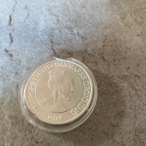 Danmarks Nationalbank 200kr mindemønt fra 2004 med portrætter af kronprins Frederik og kronprinsesse Mary 14 May på den ene side og dronning Margrethe II på den anden side.