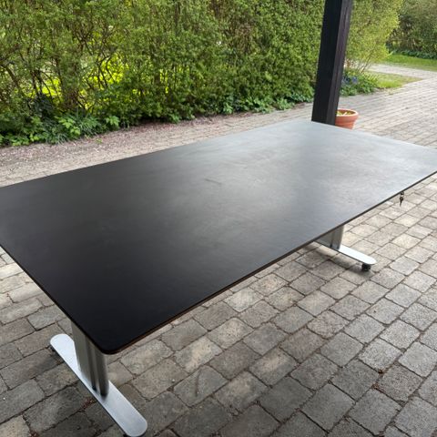 Montana skrivebord med sort linoleum bordplade og sølvfarvet stel. Rektangulær bordplade med to kabelgennemføringer. Egnet som arbejdsbord eller kontorbord i hjemmekontor eller på arbejdsplads.
